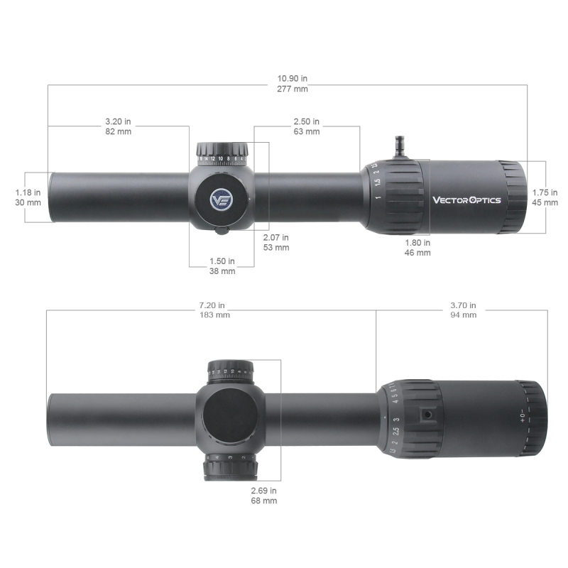 - ■ Compacta & durabila: lungime 277–280 mm, greutate ~525–530 g, waterproof (IP67/IPX6), fog-proof si rezistenta la socuri de pana la 1000 G (.338 Lapua Magnum)