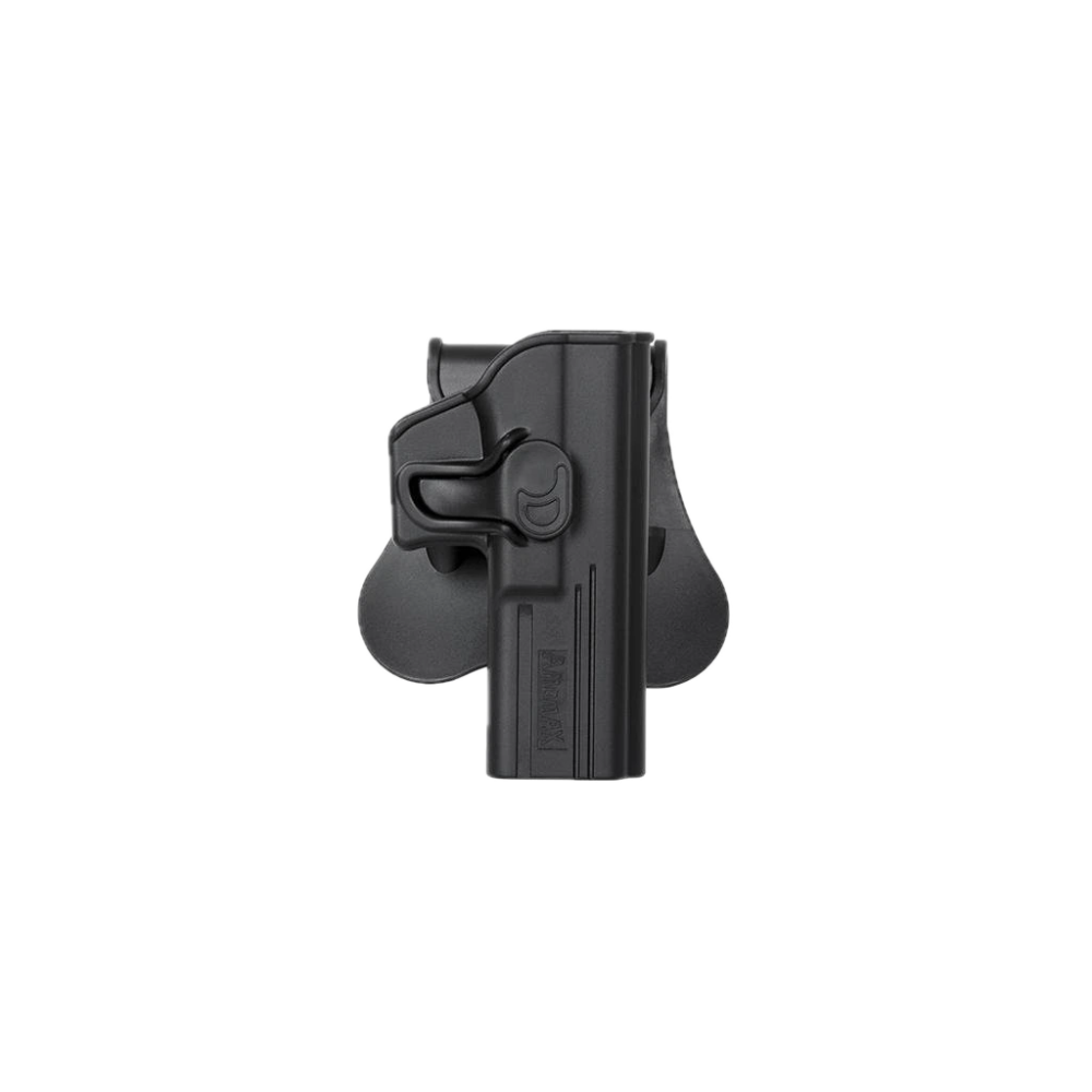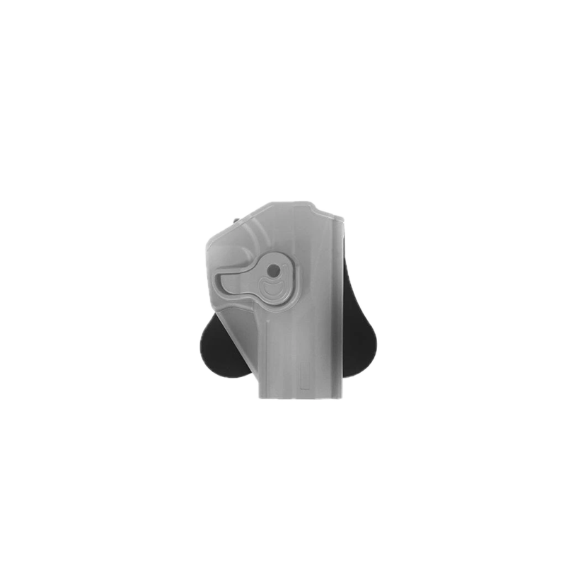 Tocul acesta pentru pistoale de tip Glock 17 este fabricat dintr-un polimer dur. Datorita capului pivotant dintre toc si prindere, poti regla unghiul tocului astfel incat sa fie cat mai natural pentru tine. Dupa introducerea armei in toc, tragaciul este complet ascuns, ceea ce creste siguranta manipularii. Mecanismul de retinere este realizat astfel incat scoaterea armei sa fie posibila doar dupa apasarea retinerii, prevenind caderea accidentala a armei. Fixarea ideala a tocului este pe curea, atasat de pantaloni. Compatibil cu arme din seria Glock 17: ATP ACP, KWA ATP, APS ACP, WE/ISSC M22, ICS BLE-XAE ...